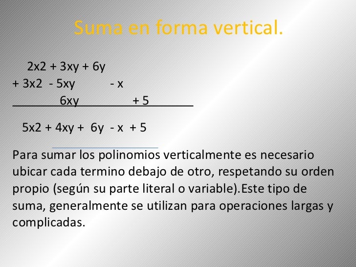 Nota: Puede suceder que el segundo termino no tenga un mismo termino semejante que el primer termino, en tal caso no se suma ni se resta con nada y por lo tanto solo se baja el termino al resultado, ejemplo: